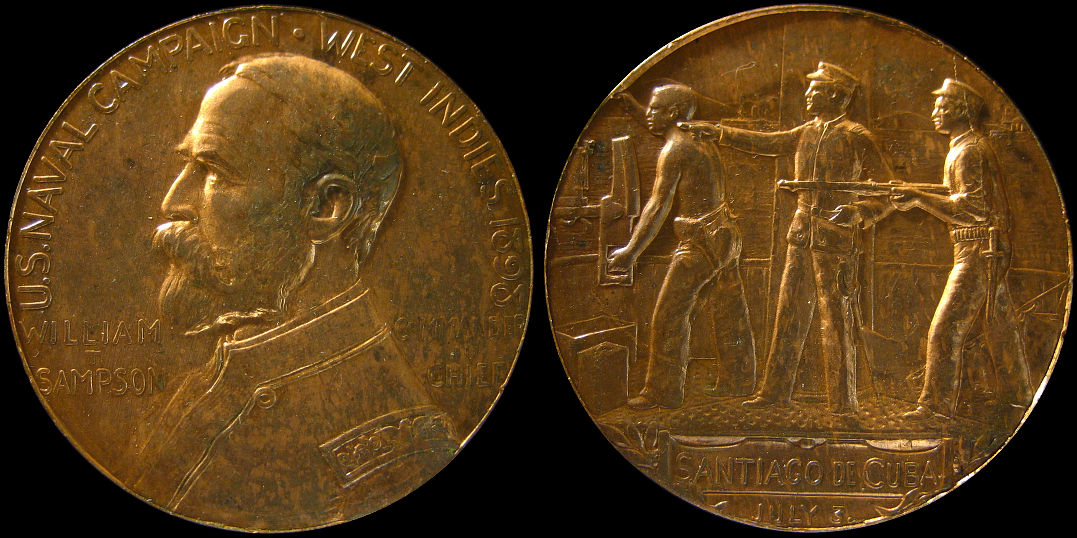 295) "U.S. Naval Campaign West Indies 1898", "William Sampson", "Commander In Chief", "Santiago De Cuba July 3.". Often found as a military participants medal with loop and hanger. There are other varieties that have "San Juan P.R", "Guantanamo", "Matanzas", and possibly others in place of "Santiago De Cuba". These latter varieties are rarer and appear to always come looped with hangers, and often with a participant name engraved on the edge. Rare. Bronze, 38.2mm. Find WILLIAM SAMPSON medals within the EXONUMIA section of ebay |