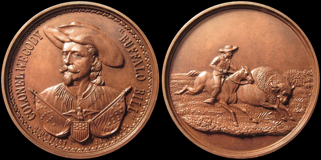 310e) Nicely executed Buffalo Bill Cody medal by James Andrew Restall of Birmingham England. No doubt made in conjunction with one of his many European tours. In small lettering around below: "Rd. No. 87687 J. A. Restall" Very Rare. Bronze. 38.4mm. Find BUFFALO BILL CODY tokens and medals on ebay |