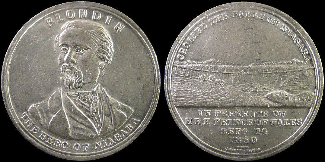 309) This somewhat crudely executed medal commemorates the crossing of Niagara Falls by Charles Blondin(born Jean Francois Gravelet) in the presence of the Prince of Wales Sept 14, 1860. Struck by J.W. Moore of Birmingham, England. Blondin was an amazing daredevil, crossing the falls many times, once blindfolded, another time on stilts. Found in white metal, but I found one described as being made of lead(Kurt Krueger sale #43 lot#1056). See below for the larger version. Rare bordering on Very Rare. White metal, 34.7mm Look at CHARLES BLONDIN ITEMS on ebay |