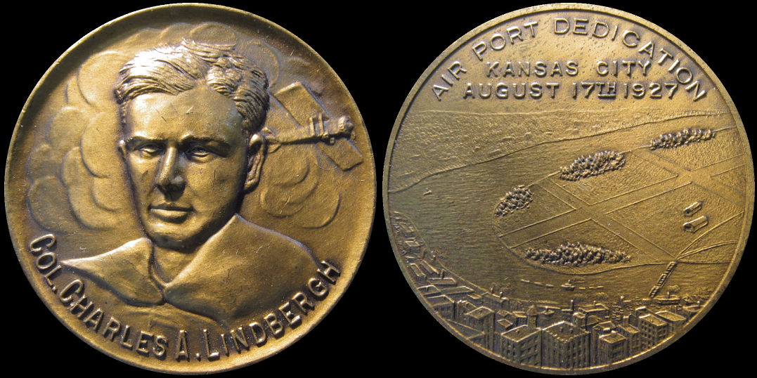 315) On August 17, 1927 Charles Lindbergh landed his Spirit of St Louis in Kansas City and dedicated New Richards Field(later renamed Kansas City Municipal Airport). His famous solo transatlantic flight occurred earlier that same year. Very Rare. Yellow bronze, 37.8mm Find CHARLES LINDBERG MEDALS and TOKENS on ebay |