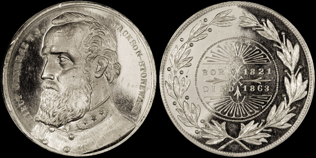 310a) Famous confederate Civil War commander Thomas Jonathan Stonewall Jackson birth/death medal. The obverse reads: "Lieut General T. J. Jackson-Stonewall". Found in Bronze and White Metal. Very to Extremely rare in either metal. White Metal, 38mm. Image Courtesy of Heritage Auctions www.ha.com |