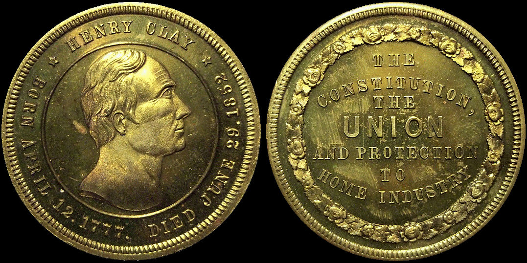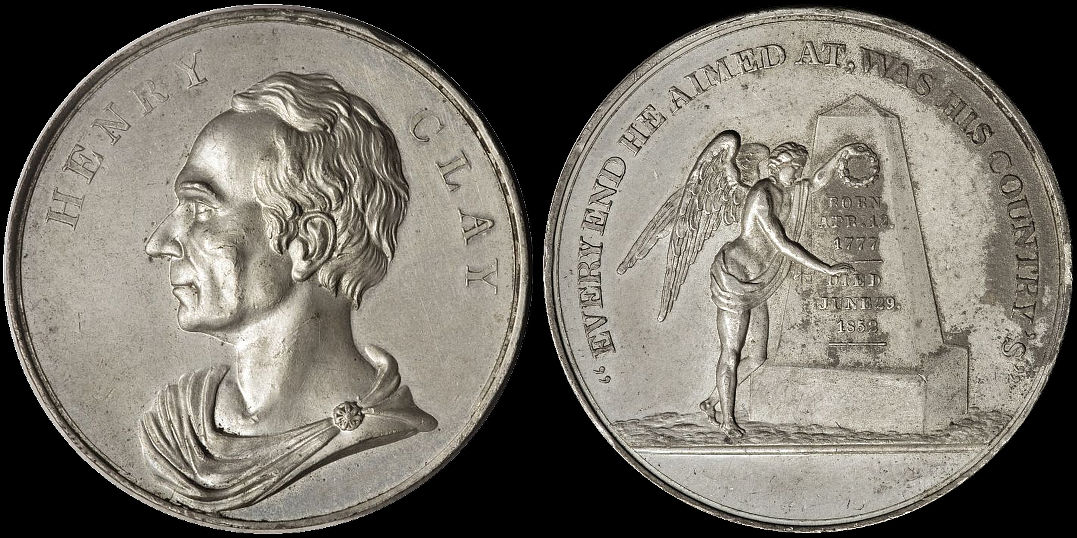 307) 1852 Henry Clay. There are of course a number of Henry Clay political medals/tokens. This one is a memorial following his death. Clay was an unsuccessful candidate for president three times, in 1824, 1832, and 1844. Rare in white metal. Extremely Rare in silver. White metal, 43.3mm. Image Courtesy of Heritage Auctions www.ha.com Find HENRY CLAY Tokens and Medals on ebay |