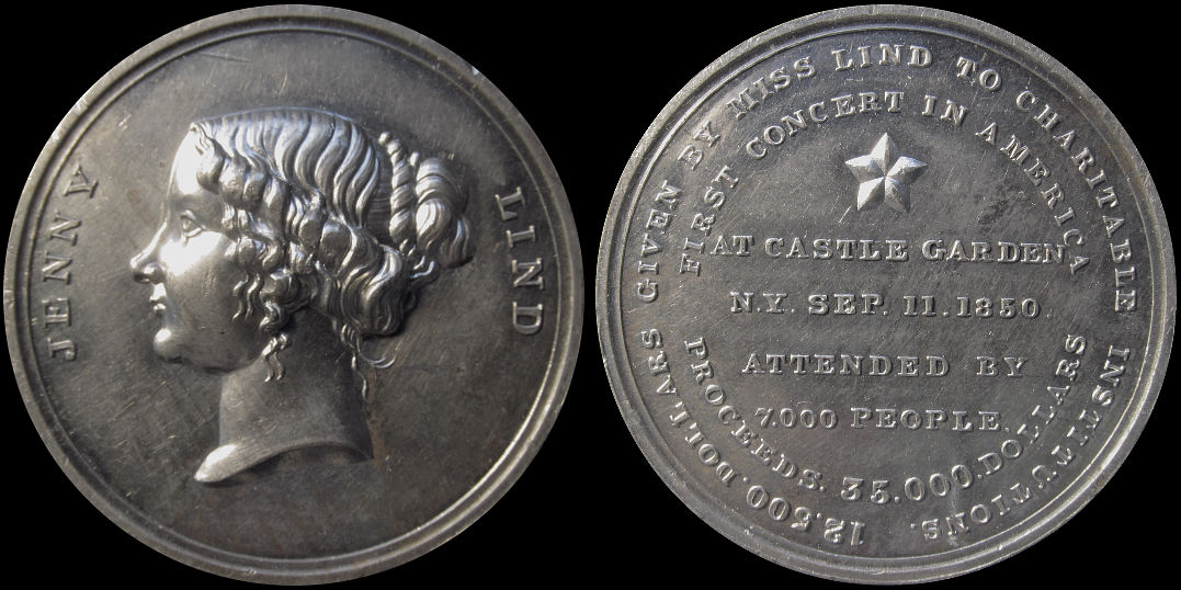 306) Commemorating Jenny Lind's performance at Castle Garden, and the "First Concert In America", New York City September 1850. With great anticipation, she was met by 30,000 people upon her New York arrival. Found in white metal and copper, with perhaps the copper one being somewhat rarer. The white metal pieces are occasionally found holed. Combining both metals together, Very Rare. White metal, 42.3mm. Look at JENNY LIND NUMISMATIC ITEMS on ebay |