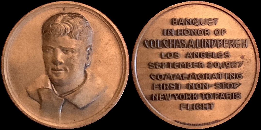 315a) Commemorating a 1927 banquet held in honor of Charles Lindbergh in Los Angeles. Struck by Robbins Co. Attleboro. Found in bronze and gold plated bronze. Combining both compositions together, Rare. 38.1mm. Image courtesy Josef Traktovenko |