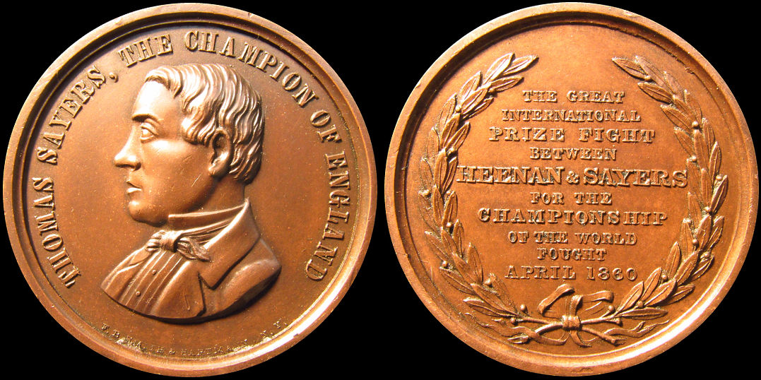 308) "Thomas Sayers, The Champion Of England" Unlisted in HKs first edition, HK10b in the second edition. In tiny lettering: "F. B. Smith & Hartman N. Y.". "The Great International Prize Fight Between Heenan & Say....". Possibly rarer than it's Heenan counterpart. Very Rare. Copper, 34mm. Look for BOXING MEDALS and TOKENS on ebay |