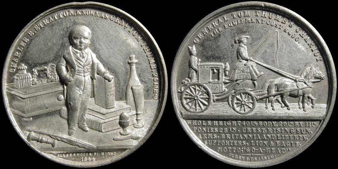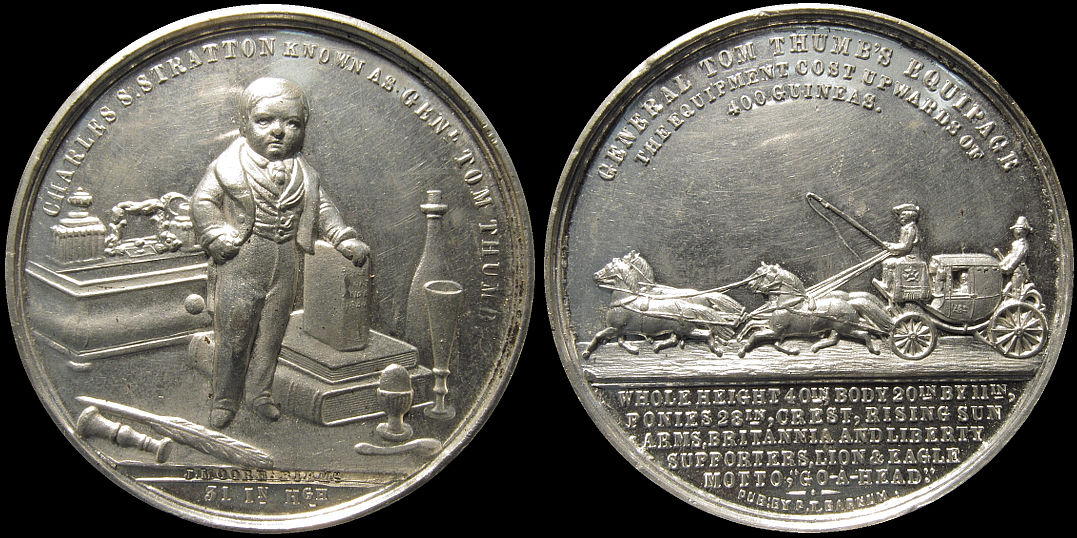 306a) General Tom Thumb was born Charles Stratton in Bridgeport, Connecticut in 1838. Under the promotion of P.T. Barnum he eventually became a world wide sensation. Ten thousand people attended his wedding reception in 1863, and twenty thousand attended his funeral in 1883. This medal and the one below were probably minted as a souvenir of his European tour, with many finding their way to the United States. It is sometimes referred to as a trade token - I guess more specifically it is similar to an advertisement/store card being that Tom Thumb was a PT Barnum promotion. In my view it is just as valid to call it a souvenir commemorative medal, and thus a so-called dollar. Barnum and Stratton were good friends throughout their lives. For reference, this and the piece below were included in an American "Privately Struck Medals" section of the John Ford Collection #9, May 10, 2005 that included the two above medals, HK1, HK2, HK297, and HK589. In exergue in tiny lettering: "Allen & Moore F: Birm. 1844". White metal, 38.4mm |