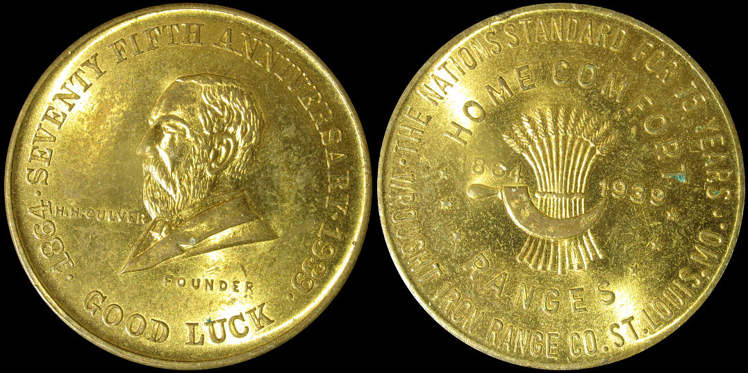 350c) Seventy Fifth Anniversary of the Wrought Iron Range Company 1939 St. Louis. "H. H. Culver Founder" Image courtesy of Dave Jensen. Very Rare. Gilt Brass, 33.2mm |