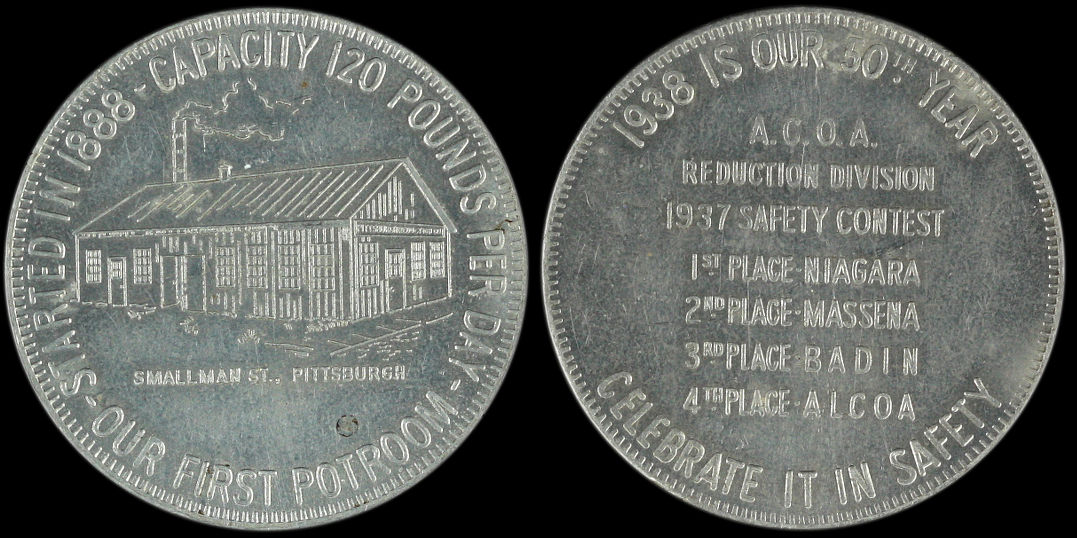 350b) From 1938, commemorating the 50th Anniversary of ALCOA showing their first Potroom at Smallman Street, Pittsburgh. A strong Very Rare, Aluminum, 35mm. Image courtesy Randy Dobler. |
