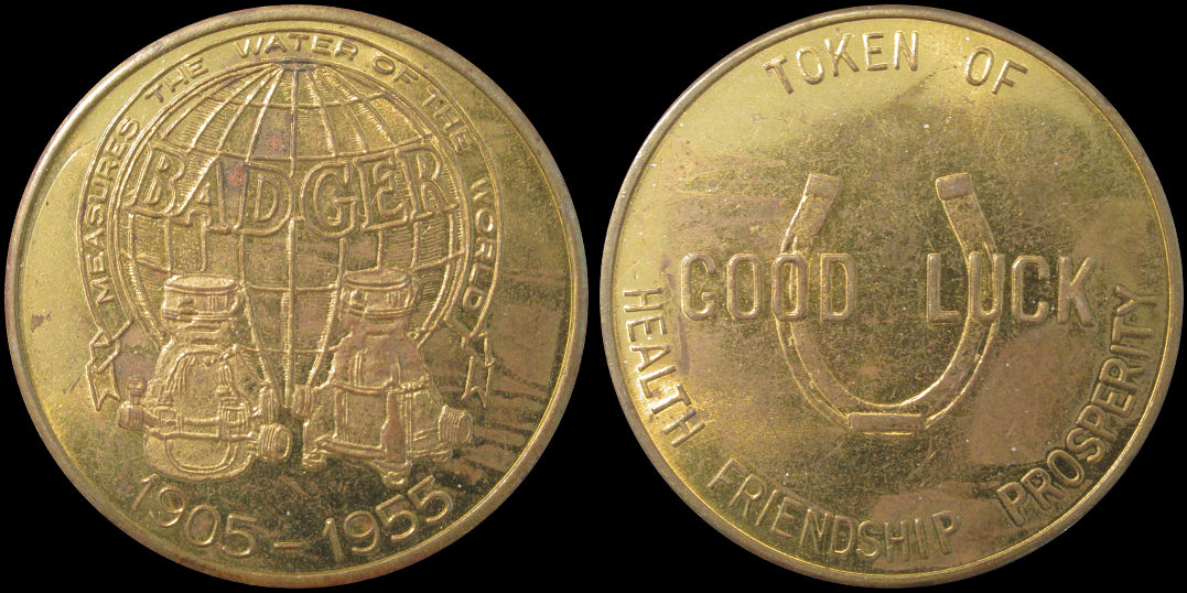 365) Commemorating the 50 year anniversary of the Badger Corporation 1905-1955. Not seen very often. Very Rare. Brass, 35.1mm. Image courtesy of Dave Jensen. |