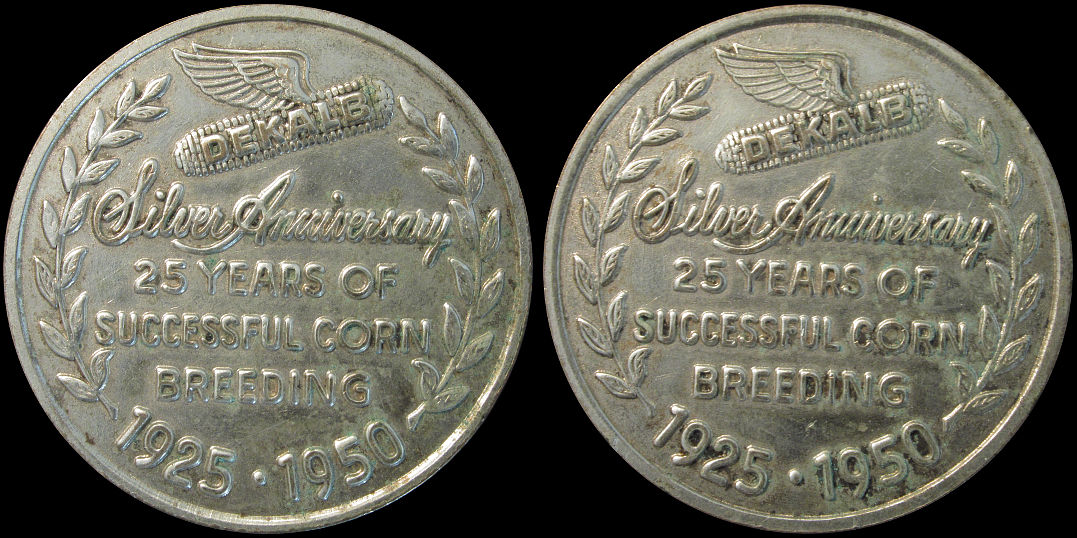 356) 1925-1950 DeKalb Silver Anniversary, 25 Years Of Successful Corn Breeding. Obverse the same as reverse. Rare. Silver plate, 35.8mm. Image courtesy of Dave Jensen. | |