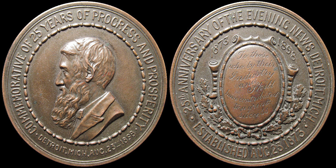 346a) 1898 25th anniversary of the Detroit Evening News. Look at Presidential sale #56 lot#1640 for an example. Very Rare. Bronze, 41.5mm |