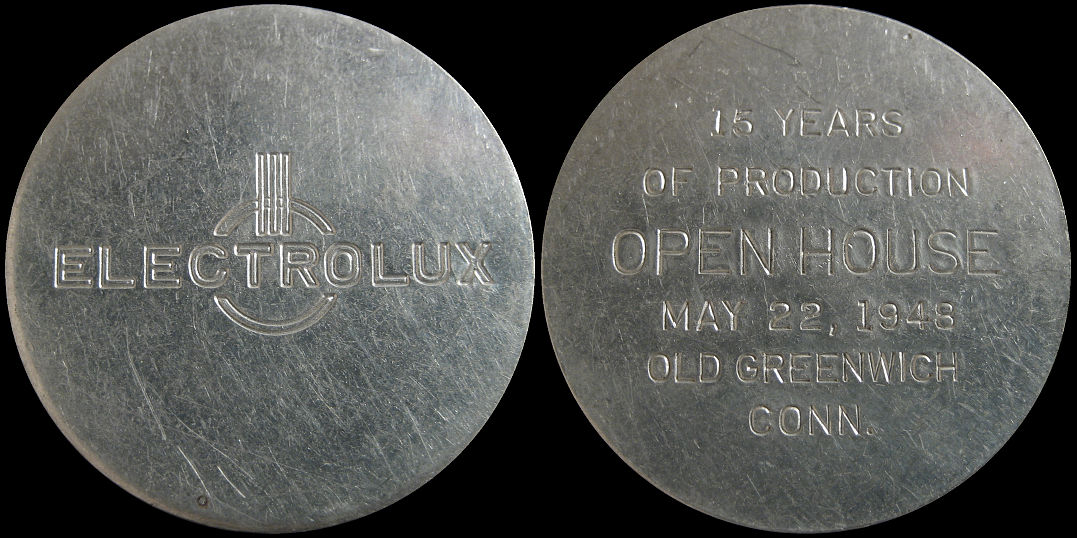 353) 15th anniversary of "Electrolux". "15 Years Of Production Open House May 22, 1948 Old Greenwich Conn.". Everything is incused. Very Rare. Aluminum, 38.6mm. |