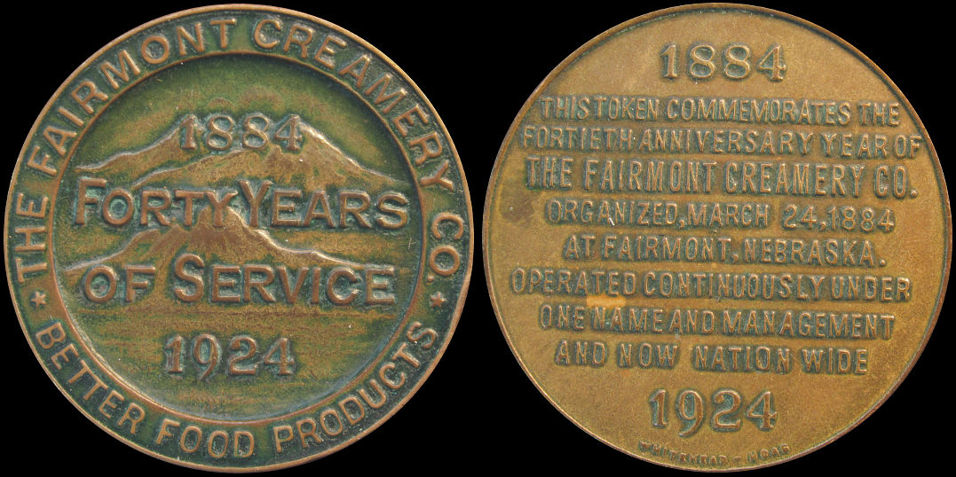 348) From the fortieth anniversary of the The Fairmont Creamery Co. 1924. Rare, bordering on Very Rare. Bronze, 35mm |