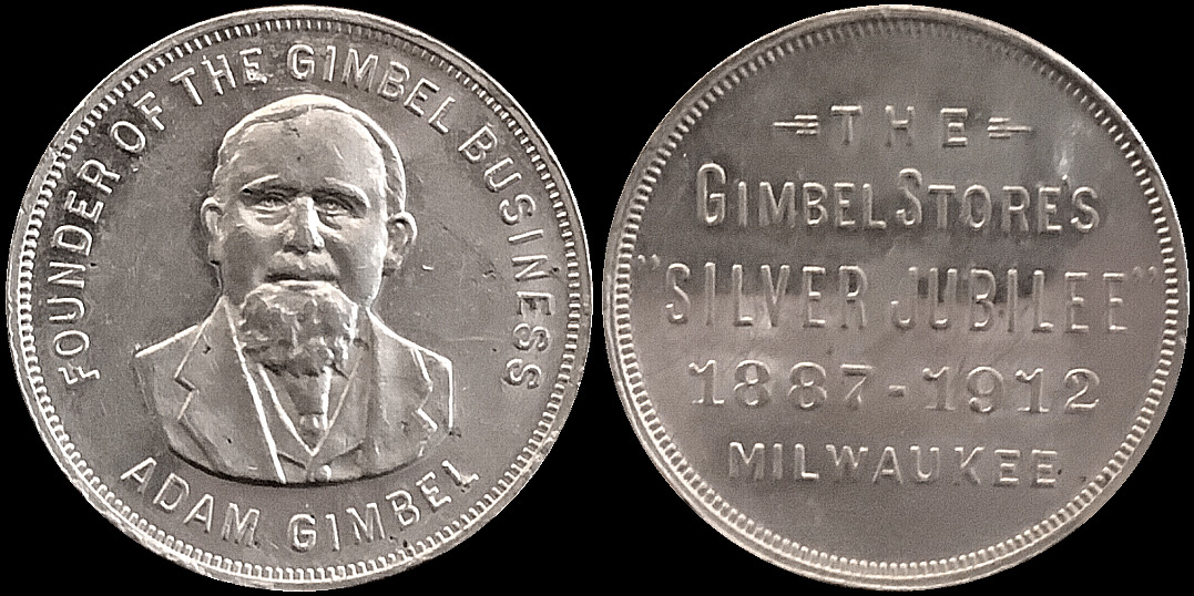 347g) Commemorating the 25th anniversary of Gimbel Stores in 1912. Rare to Very Rare, Aluminum, 33mm. Image courtesy Josef Traktovenko |