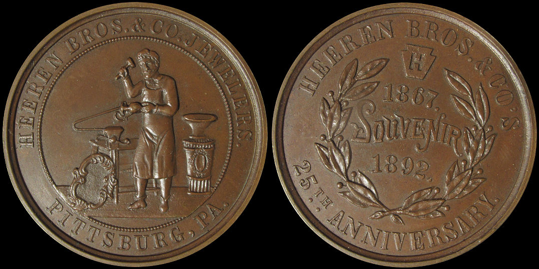 345) 1892 Heeren Brothers 25th anniversary medal. Besides jewelry, this company also struck tokens and medals. An example of this medal can be found in Presidential Coin & Antique Co. Auction #57 lot#1595. Image courtesy of Dave Jensen. Very Rare, Bronze, 44.9mm |