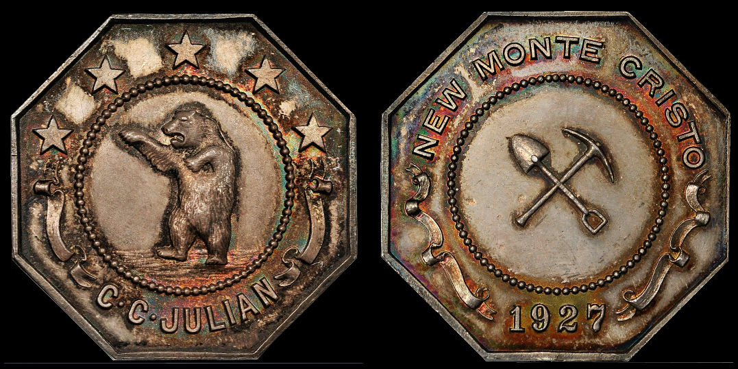 344a) The New Monte Cristo mine was a devious scheme created by the con man C.C. Julian to bilk investors of their money. Silver, 41.8mm. Image Courtesy of Stacks Bowers Galleries www.stacksbowers.com |