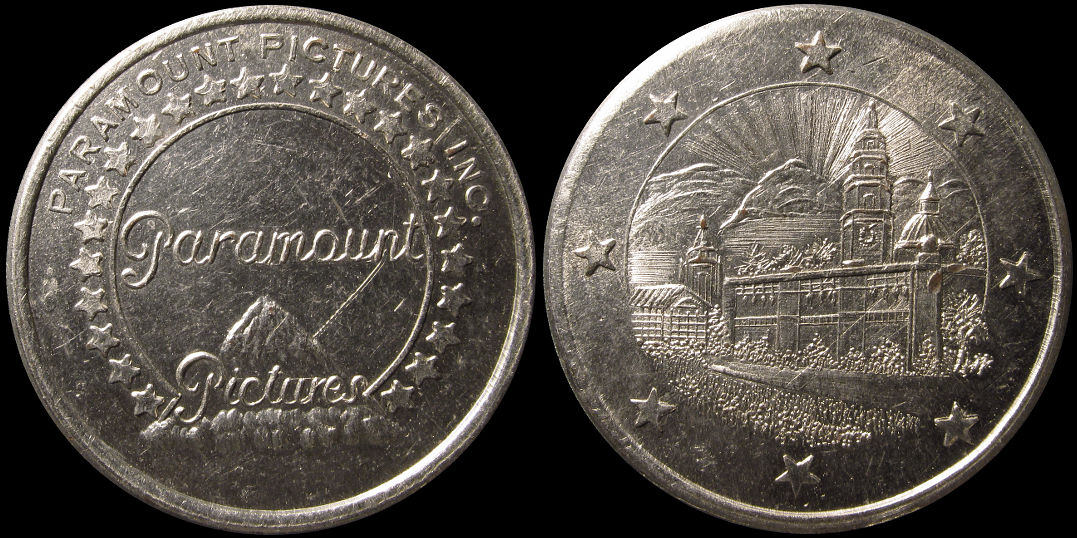 351) Souvenir piece from "Paramount Pictures". This has the same reverse as HK740. Undated. "So-Called Dollars From The Pacific Coast Expositions" by Jeff Shevlin and Bill Hyder reveals that the obverse view of this piece depicts the 1935 California Pacific International Exposition. This expo is not included in HK. Probably rarer than HK740. Rare. Nickel, 38.5mm. Shevlin/Hyder SH 22-2. |