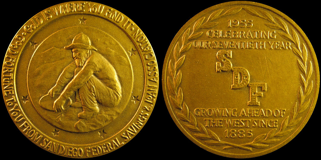 364) "San Diego Federal Savings & Loan" 1955. I have seen a fair number of these over the years. Scarce. Brass, 38.1mm. |