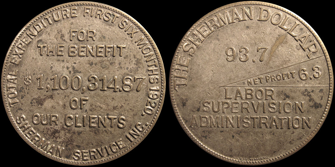 373) The Sherman Dollar. Another piece similar to the Swift dollars HK905-HK907. Very Rare. Silver plated brass, 38.2mm |