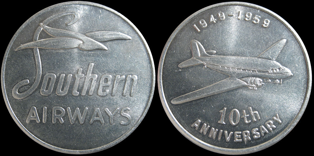 369) 10th anniversary of "Southern Airways". I have also seen one in an NGC slab described as brass. . Very Rare. Aluminum, 39.1mm. |