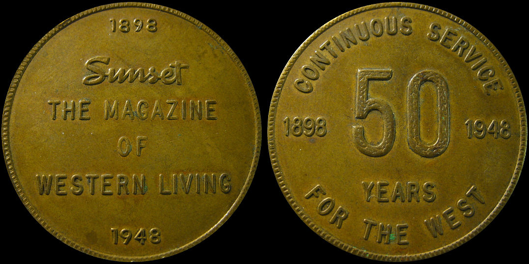 352) 50th anniversary of Sunset Magazine. I have rarely found this piece. Very Rare. Brass, 35.4mm. |