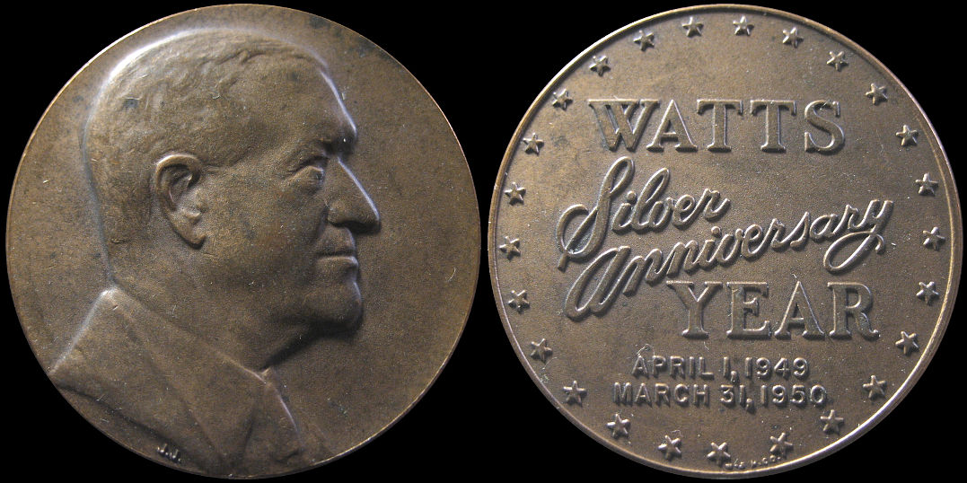 354) "Watts Silver Anniversary Year April 1, 1949 March 31, 1950". In tiny lettering next to rim: "W. & H. Co.". Found in both bronze and silver. Very rare in Bronze and sometimes holed. Extremely Rare in silver. Bronze, 34.9mm.  Shop for SO CALLED DOLLARS on ebay |